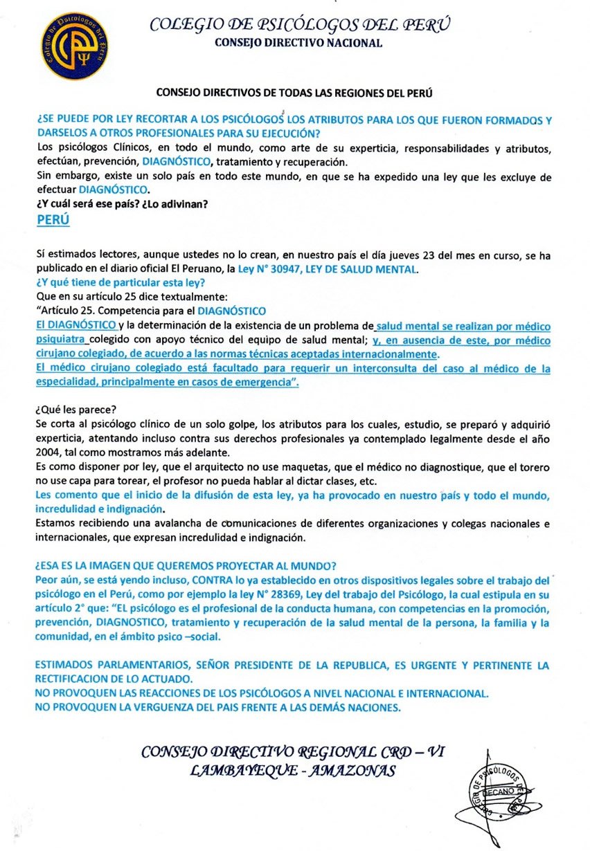 PONUNCIAMIENTO DEL COLEGIO DE PSICÓLOGOS ANTE ESTA CRISIS NACIONAL